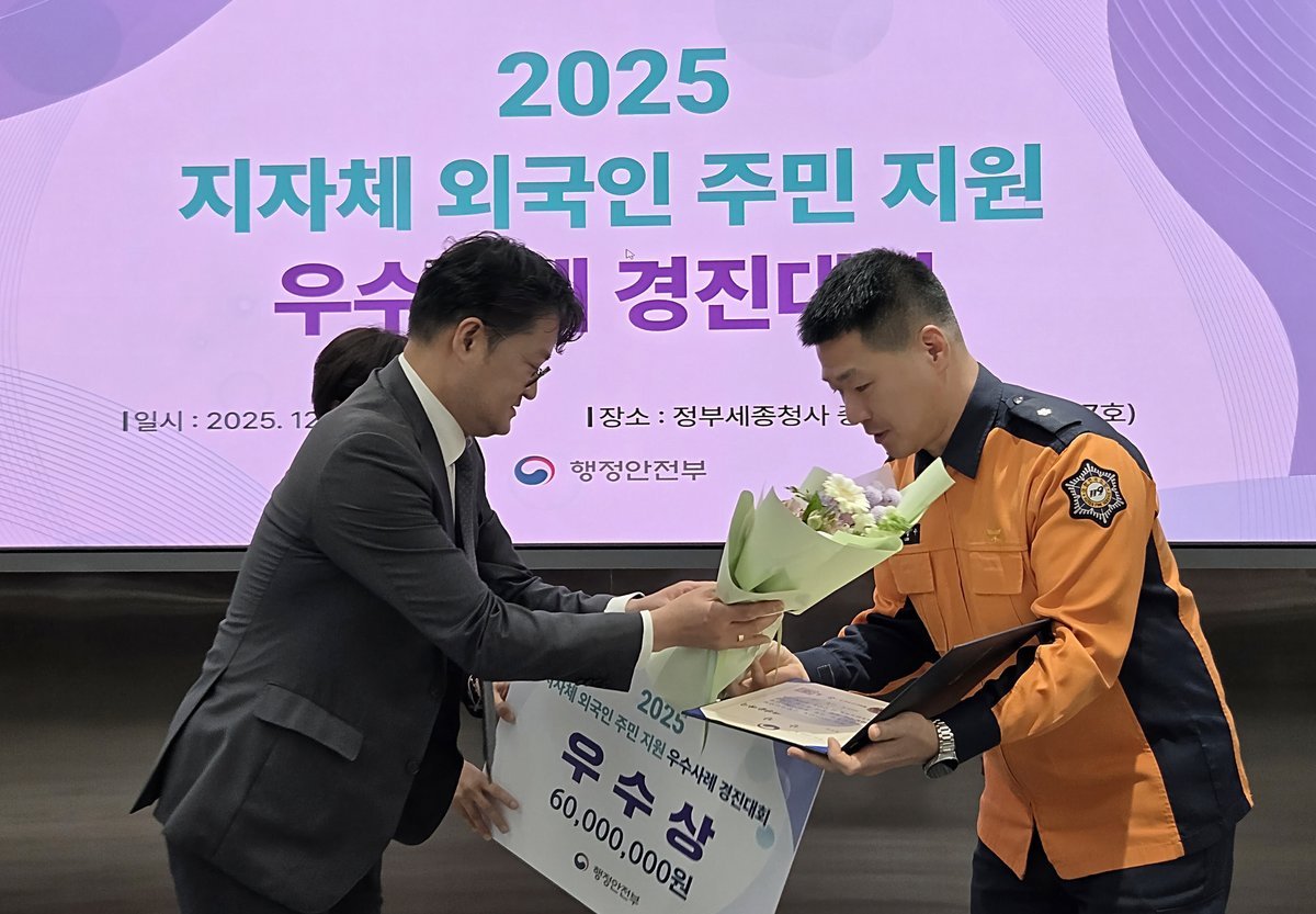 [Ytv영상스토리] 대전동부소방서는 1일 정부세종청사에서 열린 「2025년 지자체 외국인주민 지원 우수사례 경진대회」에서 대전시 대표로 출전한 ‘외국인 주민과 함께하는 119안전라이프+’가 행정안전부 장관상인 우수상을 수상했다.