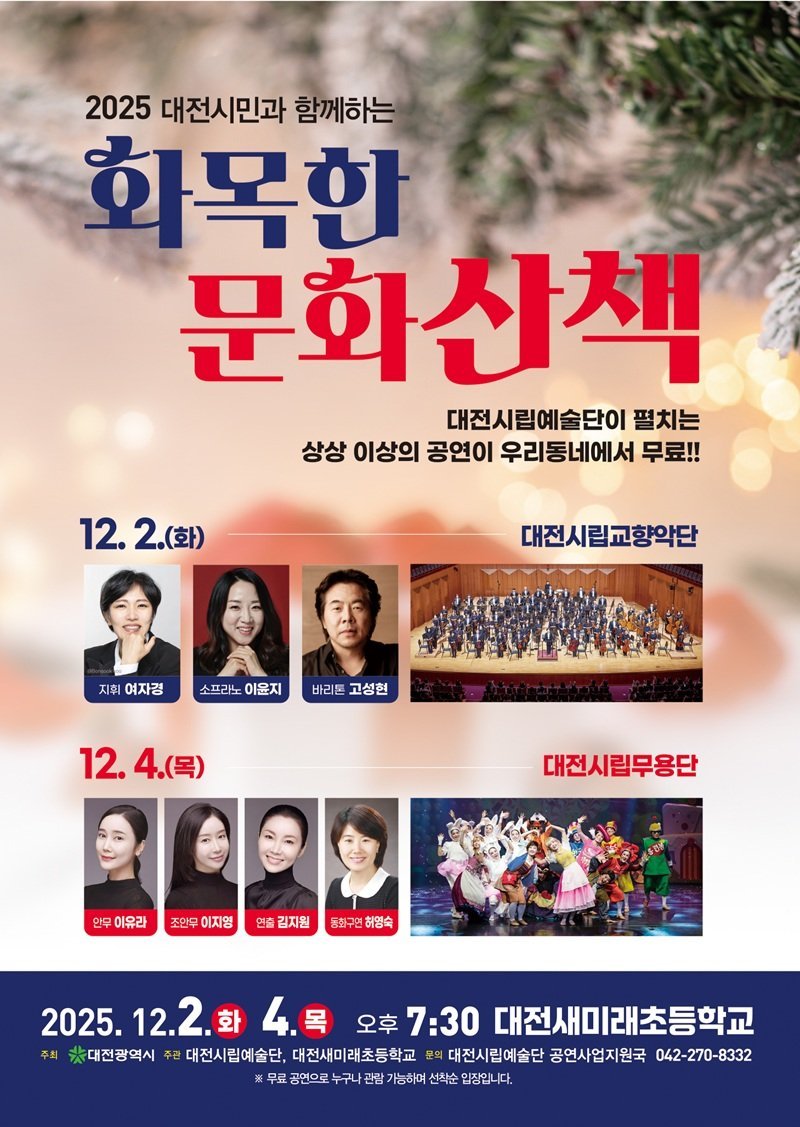 대전시립예술단 관계자는 “가족, 이웃과 함께 즐길 수 있는 ‘화목한 문화산책’을 통해 일상의 순간이 예술로 특별해지길 바란다”라며 “올해의 마지막 공연인 만큼 많은 주민이 찾아오셔서 따뜻하고 풍성한 연말 추억을 만들어 가시길 바란다”라고 전했다.