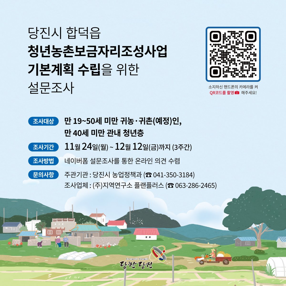 시 관계자는“설문조사를 통해 제안된 의견을 기본계획 수립에 적극 반영해 당진시에 귀농귀촌하는 청년층의 주거부담을 완화하고 청년층 유입을 통해 농촌의 지속가능성을 높이도록 한다”며 “더 나은 당진시의 미래를 위하여 시민들의 소중한 의견이 필요하며 설문조사에 적극 참여 부탁드린다”고 말했다.