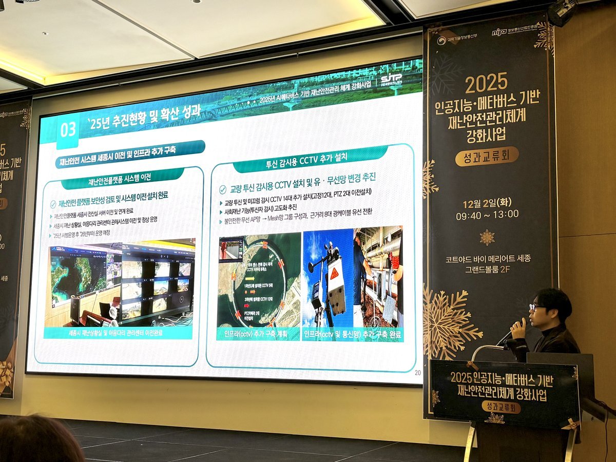 [Ytv영상스토리] 세종특별자치시가 2일 코트야드바이메리어트세종에서 열린 ‘2025년 인공지능·메타버스 기반 재난안전관리체계 강화사업 성과교류회’에서 인공지능 기반 재난안전관리 구축 사례를 공유했다.