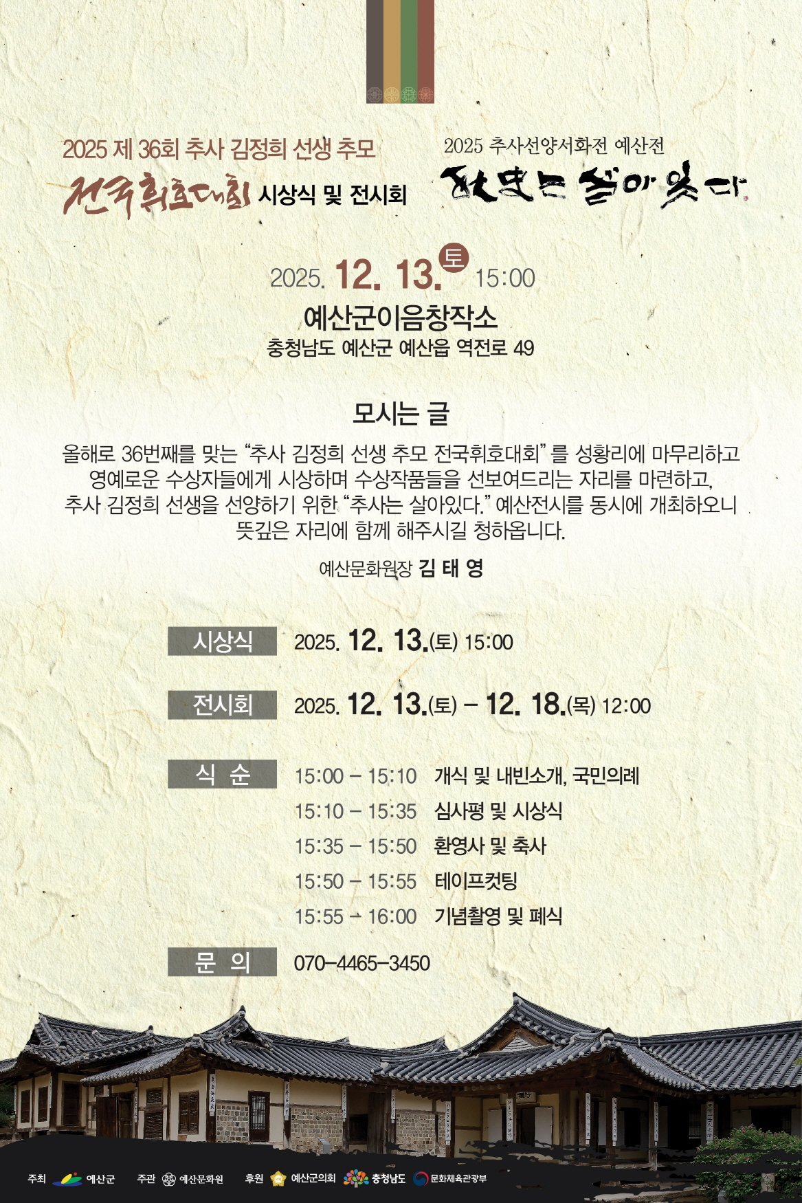 문화원 관계자는 “추사 김정희 선생의 예술 정신을 기리는 전국 규모의 대회를 통해 서예문화 확산에 기여하고 있다”며 “많은 분들이 전시를 통해 서예의 깊이와 가치를 느끼길 바란다”고 말했다.
