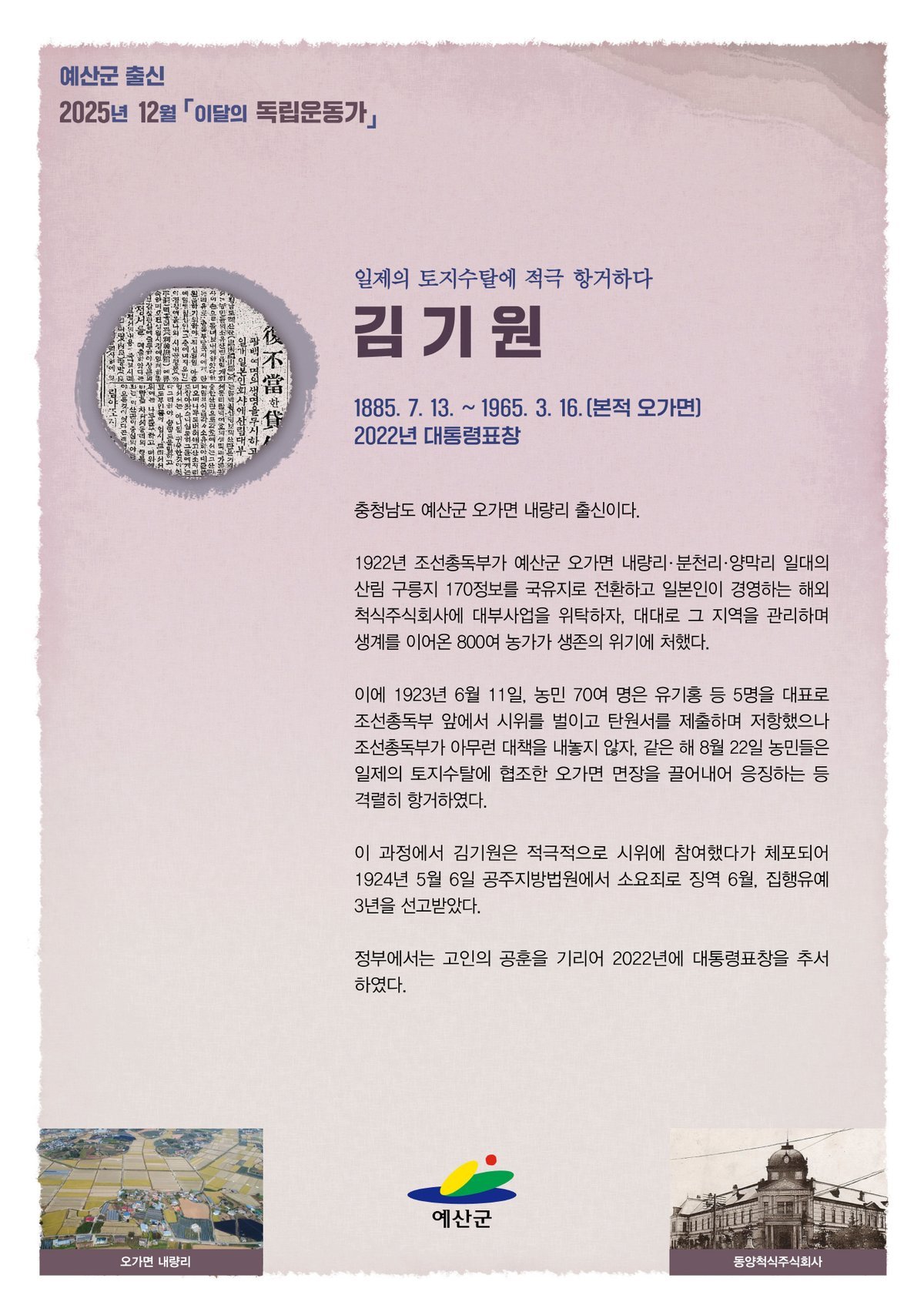 예산군, 2025년 12월 이달의 독립운동가 오가면 김기원 선정 (예산군 제공)
