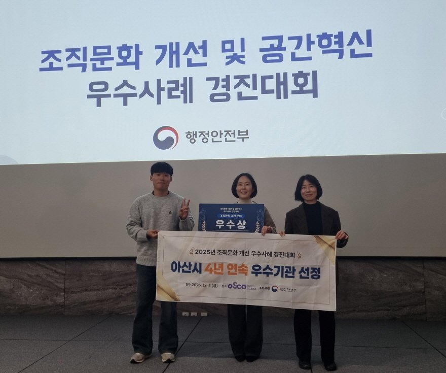 [Ytv영상스토리] 아산시는 5일 청주 오송컨벤션센터에서 열린 행정안전부 주관 ‘2025년 조직문화 개선 우수사례 경진대회’에서 우수상을 수상했다.