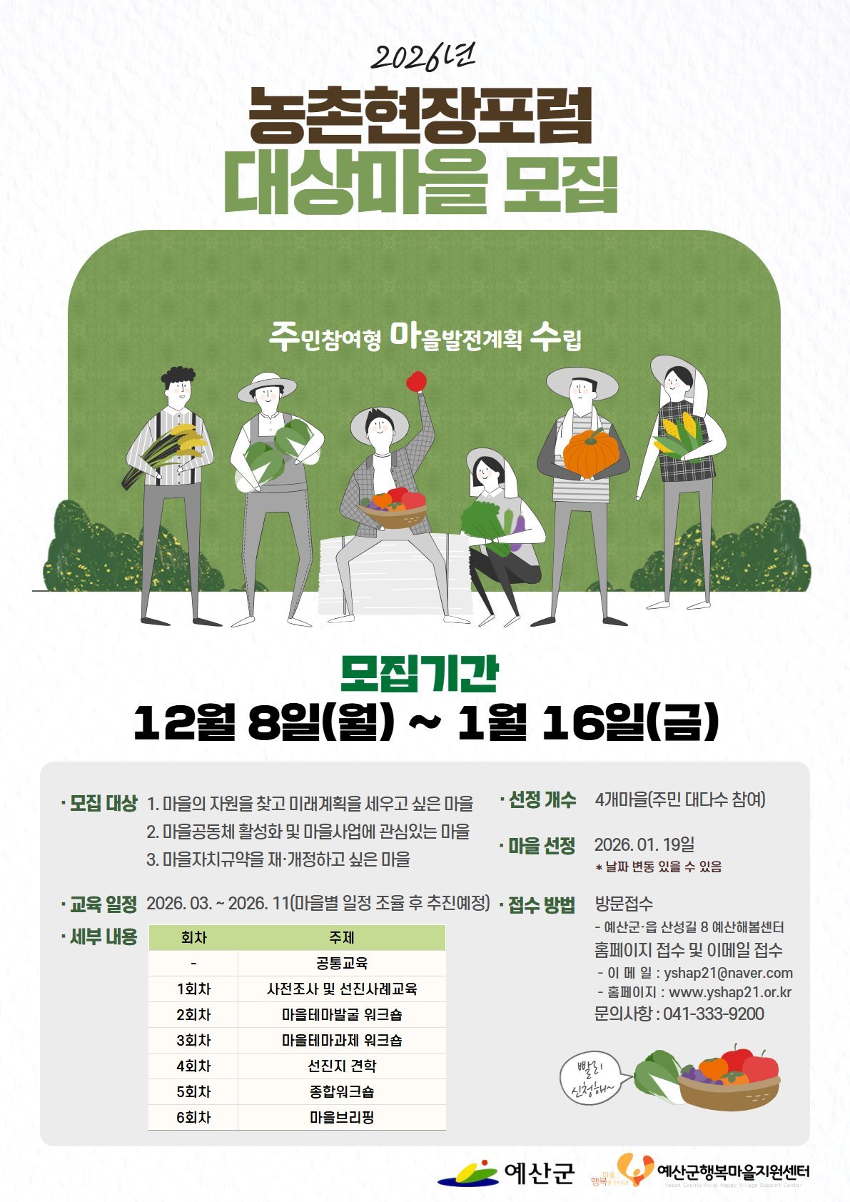 [Ytv영상스토리] 예산군과 예산군행복마을지원센터는 2026년 주민주도 마을발전계획수립에 참여할 대상마을을 내년 1월 16일까지 모집한다고 밝혔다.