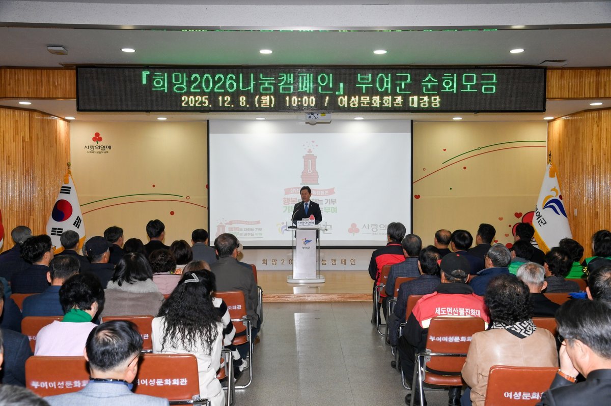 [Ytv영상스토리] 부여군 은 ‘행복을 더하는 기부, 기부로 바꾸는 부여 ’라는 구호 아래 「 희망 2026 나눔 캠페인 」 순회 모금 행사를 지난 8일 여성문화회관 3층 대강당에서 개최했다.