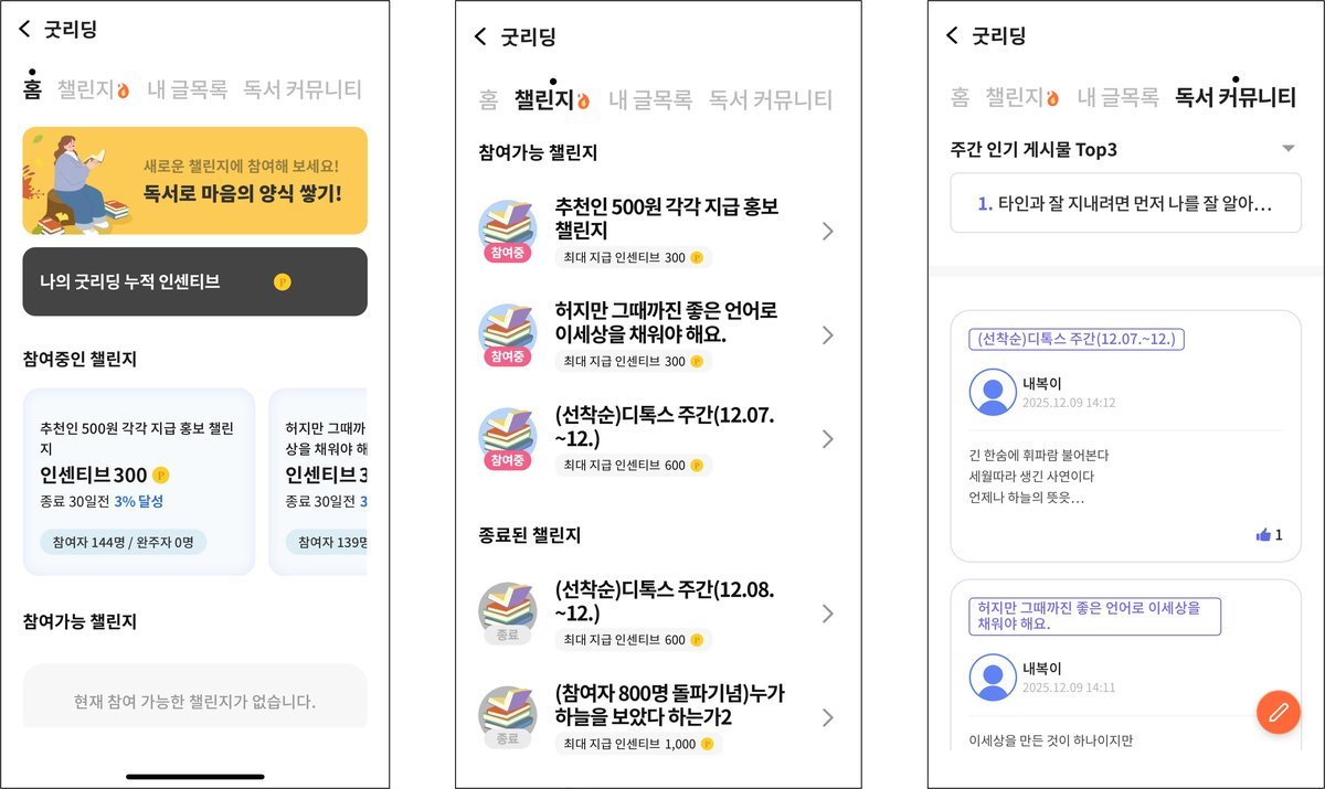 군에 따르면 굿리딩 활성 이용자는 하루 평균 수백 건의 게시글을 남기고 있으며, 전체 게시글의 약 70%가 ‘오늘 있었던 일’, ‘감정 정리’, ‘책 한 문장 기록’등 가벼운 루틴형 콘텐츠로 구성되어 있다.