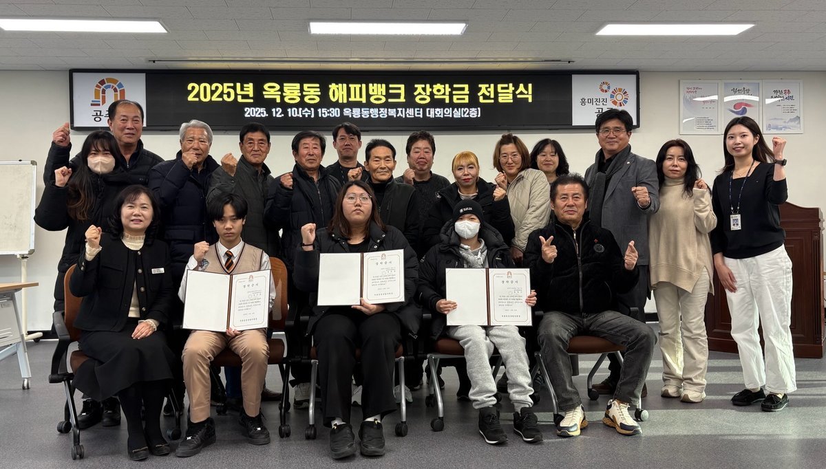 [Ytv영상스토리] 공주시 옥룡동 해피뱅크는 지난 10일 옥룡동 행정복지센터에서 옥룡동에 거주하는 학생 3명에게 ‘2025년 옥룡동 해피뱅크 장학금’을 전달했다고 밝혔다.