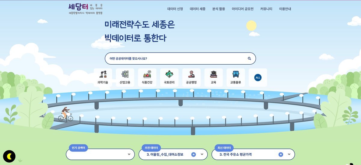 ‘세담터’는 2022년 12월 시민 누구나 세종시 데이터를 쉽게 접하고 활용할 수 있도록 구축한 누리집이다.