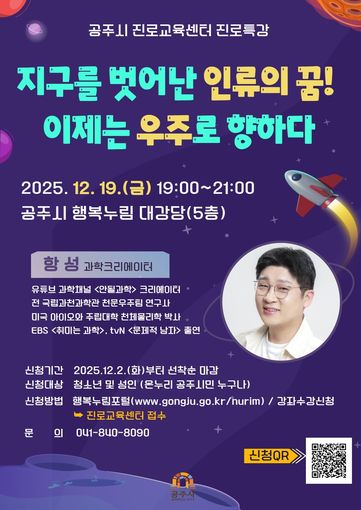 박찬옥 평생학습과장은 “이번 특강은 단순한 과학 강연을 넘어, 청소년들이 미래를 준비할 때 ‘우주’와 ‘과학’을 구체적인 진로로 고려해 볼 수 있는 기회를 제공하고자 마련했다”며 “과학적 사고를 넓히고 미래 설계에 동기를 부여하는 뜻깊은 자리가 되기를 바란다”고 말했다.