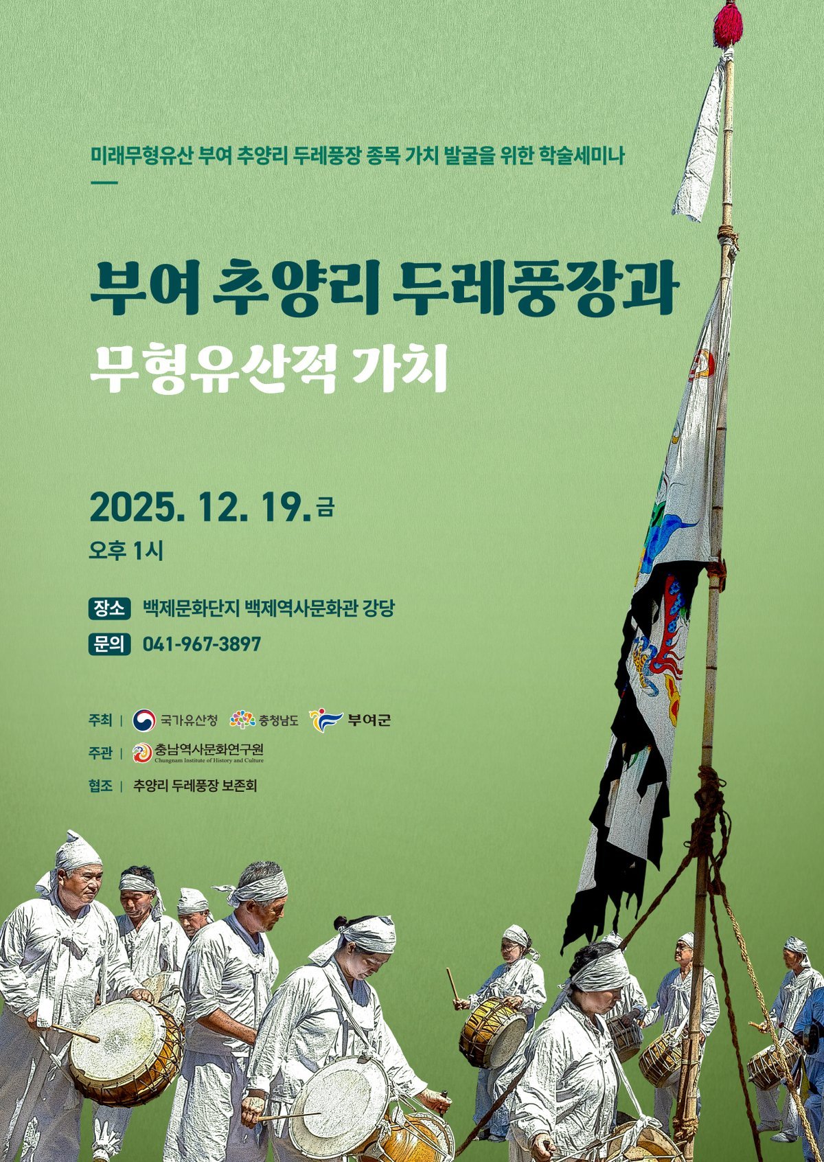 이번 세미나는 2025년 미래무형유산으로 선정된 부여 추양리 두레풍장*의 종목 가치 발굴을 위해 마련되었으며, 국가유산청, 충청남도, 부여군이 공동으로 주최하고 충남역사문화연구원이 주관한다.