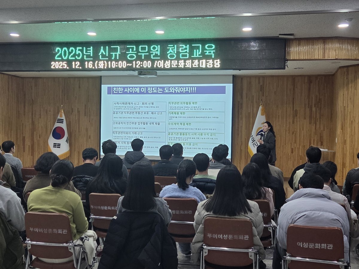 [Ytv영상스토리] 부여군은 지난 16일 여성문화회관 대강당에서 신규공무원 60여 명을 대상으로 청렴 교육을 진행했다.