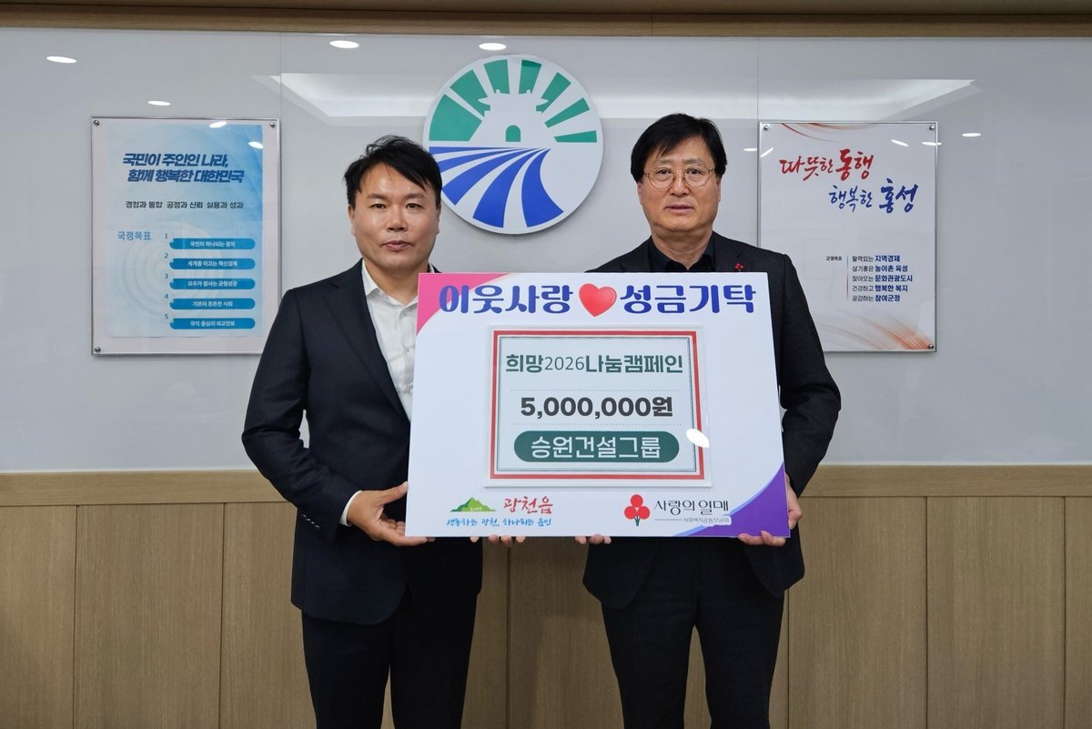[Ytv영상스토리] 홍성군은 지난 16일 승원건설그룹이 광천읍에 방문하여 ‘희망2026 나눔캠페인’이웃사랑 성금 500만원을 기탁했다고 밝혔다.