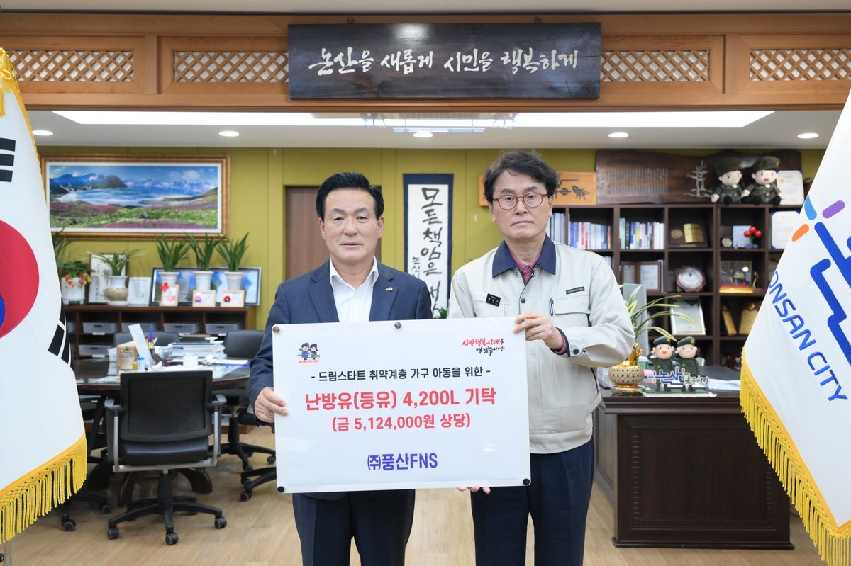 [Ytv영상스토리] 논산시는 15일 국방산업 전문기업 ㈜풍산FNS가 저소득 아동들을 위해 약 500만 원 상당의 등유 4200리터를 기탁했다고 밝혔다.