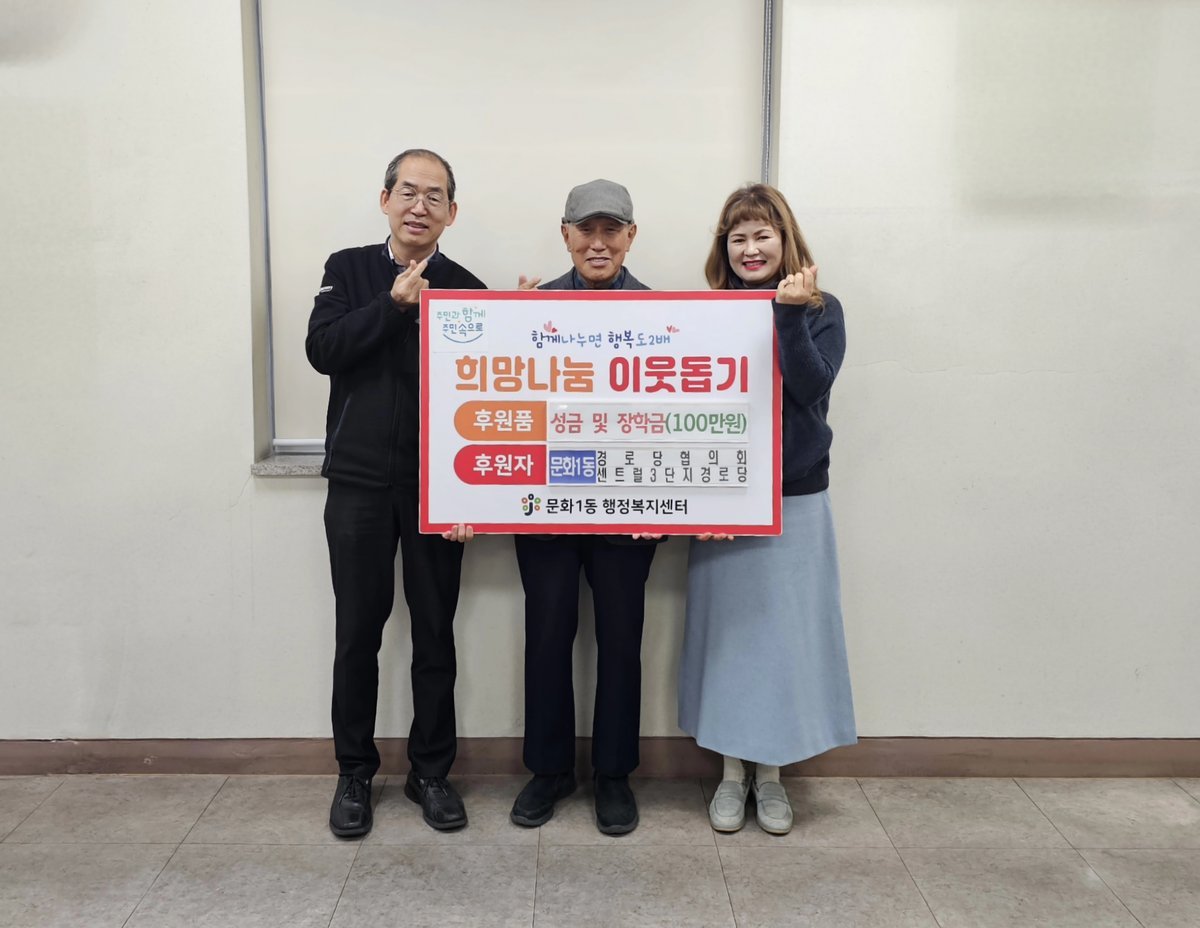이번 후원은 문화 1 동 경로당협의회가 매년 꾸준히 실천해 오고 있는 이웃돕기성금 및 장학금 지원 50만 원과, 센트럴 3 단지 경로당에서 추가로 지원한 장학금 50만 원으로 구성되어 지역사회에 따뜻한 나눔의 가치를 전했다.