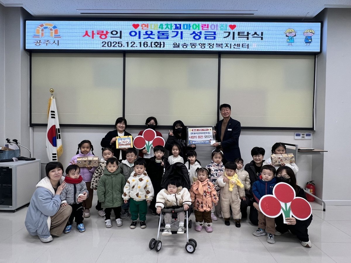 [Ytv영상스토리] 공주시 월송동은 지난 16일 현대4차꼬마어린이집 원아와 교직원이 뜻을 모아 마련한 성금을 월송동 행정복지센터에 전달받았다고 밝혔다.