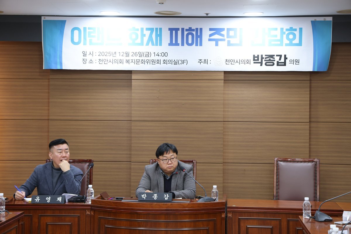 [Ytv영상스토리] 천안시의회 박종갑 의원은 12월 26일 2시, 천안시의회 복지문화위원회 회의실에서 ‘이랜드 화재 피해 주민 간담회’를 열고, 풍세 지역 주민들의 피해 호소를 직접 청취했다.