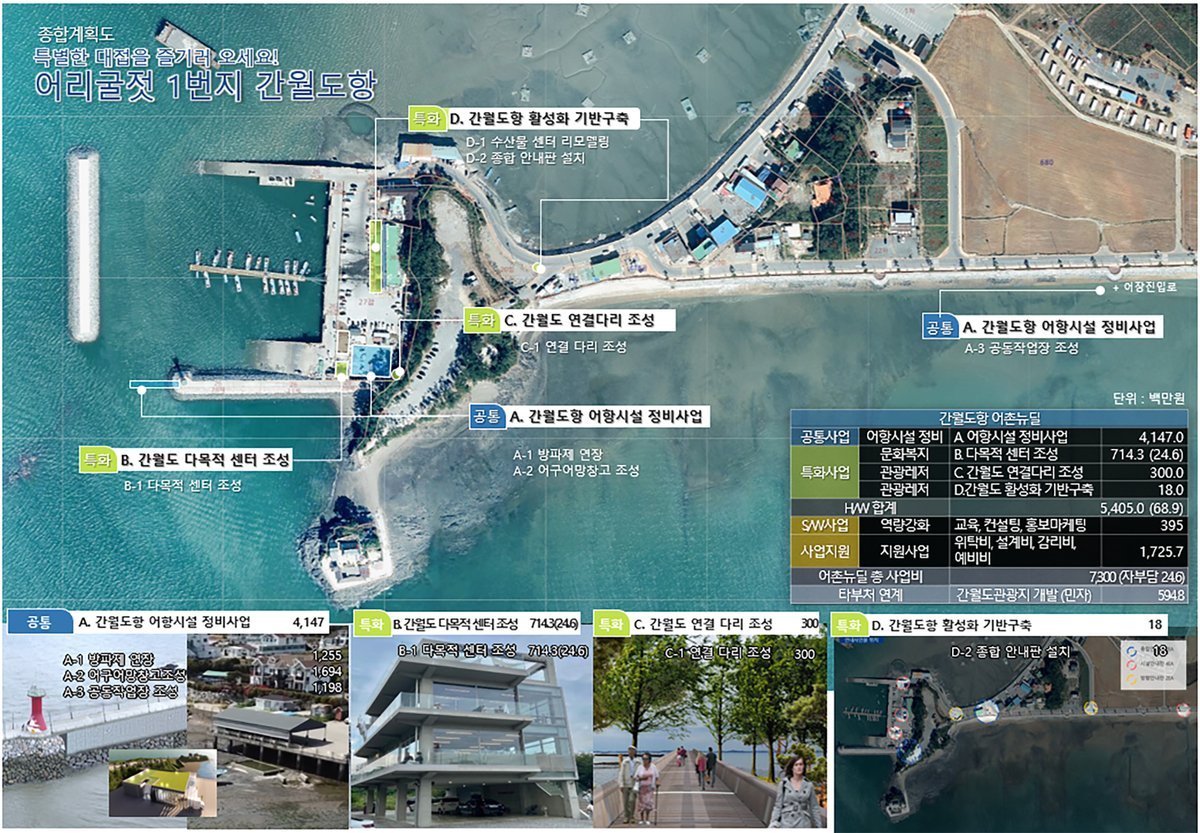 주요 사업으로 간월암과 간월도항을 직접 연결하는 다리를 신설하며, 이를 통해 간월암을 방문한 관광객이 상권이 형성된 간월도항으로 자연스럽게 이동할 수 있게 될 전망이다.