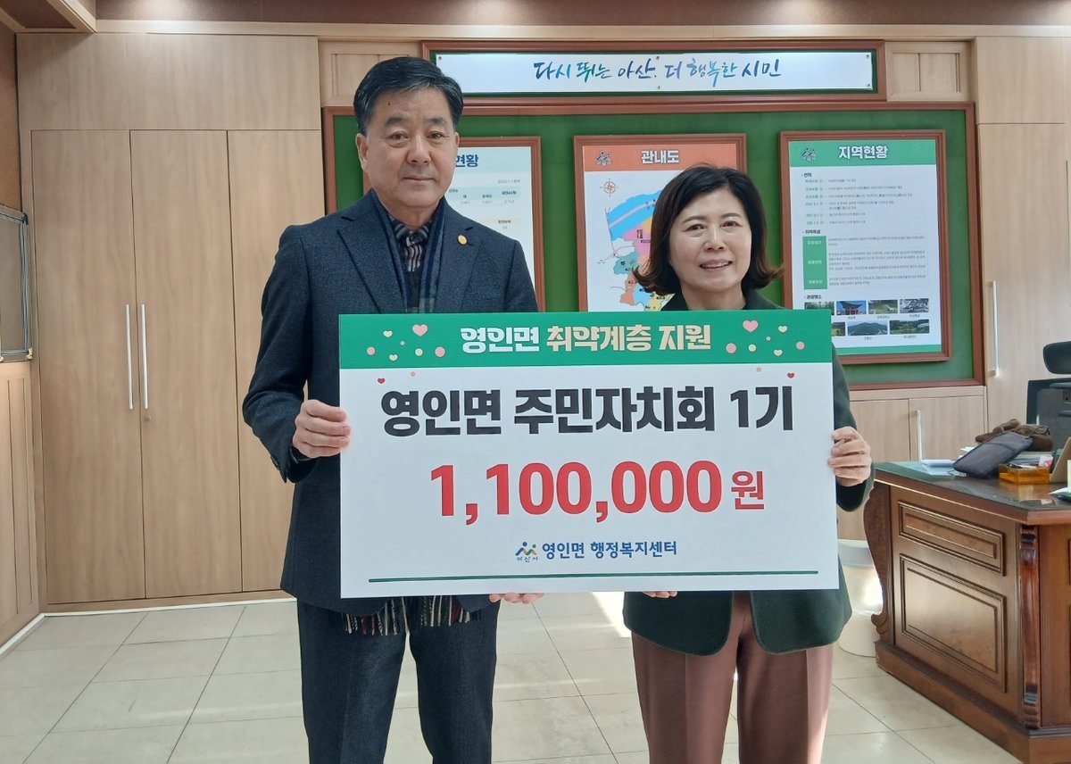 김은경 영인면장은 “모두가 어려운 시기임에도 이웃을 위한 따뜻한 나눔을 실천해 주신 주민자치회 회원 여러분께 감사드린다”며 “기탁해 주신 성금이 꼭 필요한 곳에 지원될 수 있도록 최선을 다하겠다”고 밝혔다.