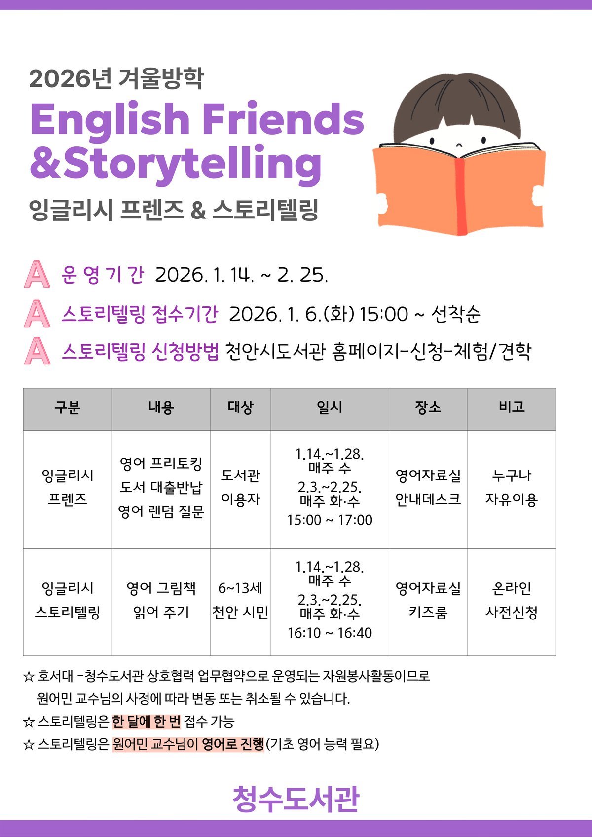 [Ytv영상스토리] 천안시 청수도서관은 겨울방학을 맞아 1~ 2월 다채로운 영어 프로그램을 운영한다고 31일 밝혔다.