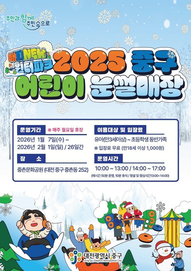 중촌문화공원 어린이 눈썰매장은 도심 속에서 아이들이 안전하고 건강하게 놀 수 있는 겨울철 가족 휴식공간으로 마련됐으며, 눈슬로프·눈놀이터·회전썰매 등 다양한 놀이시설과 함께 휴게시설이 갖춰져 있다.