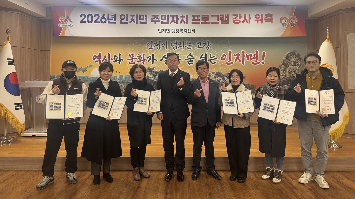 [Ytv영상스토리] 서산시 인지면은 1월 2일 지역주민의 삶의 질 향상과 문화·복지 증진을 위해 「2026년 주민자치 프로그램 강사 위촉식」을 갖고 주민자치 프로그램을 본격 운영한다고 밝혔다.