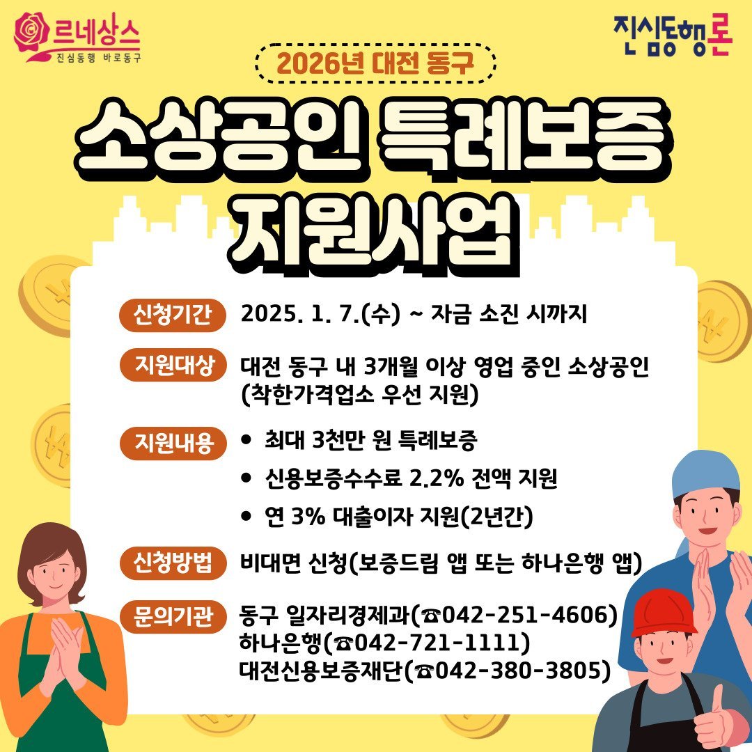 한편, 사업과 관련한 자세한 사항은 동구청 누리집 고시공고를 확인하거나 동구청 일자리경제과, 하나은행, 대전신용보증재단으로 문의하면 된다.