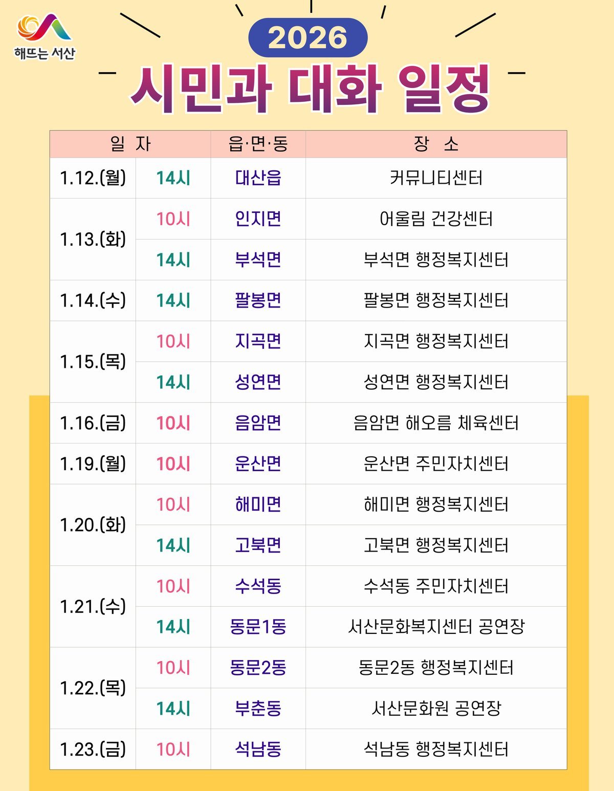 대화는 12일 대산읍을 시작으로 13일 인지면·부석면, 14일 팔봉면, 15일 지곡면·성연면, 16일 음암면으로 첫 주를 마무리한다.
