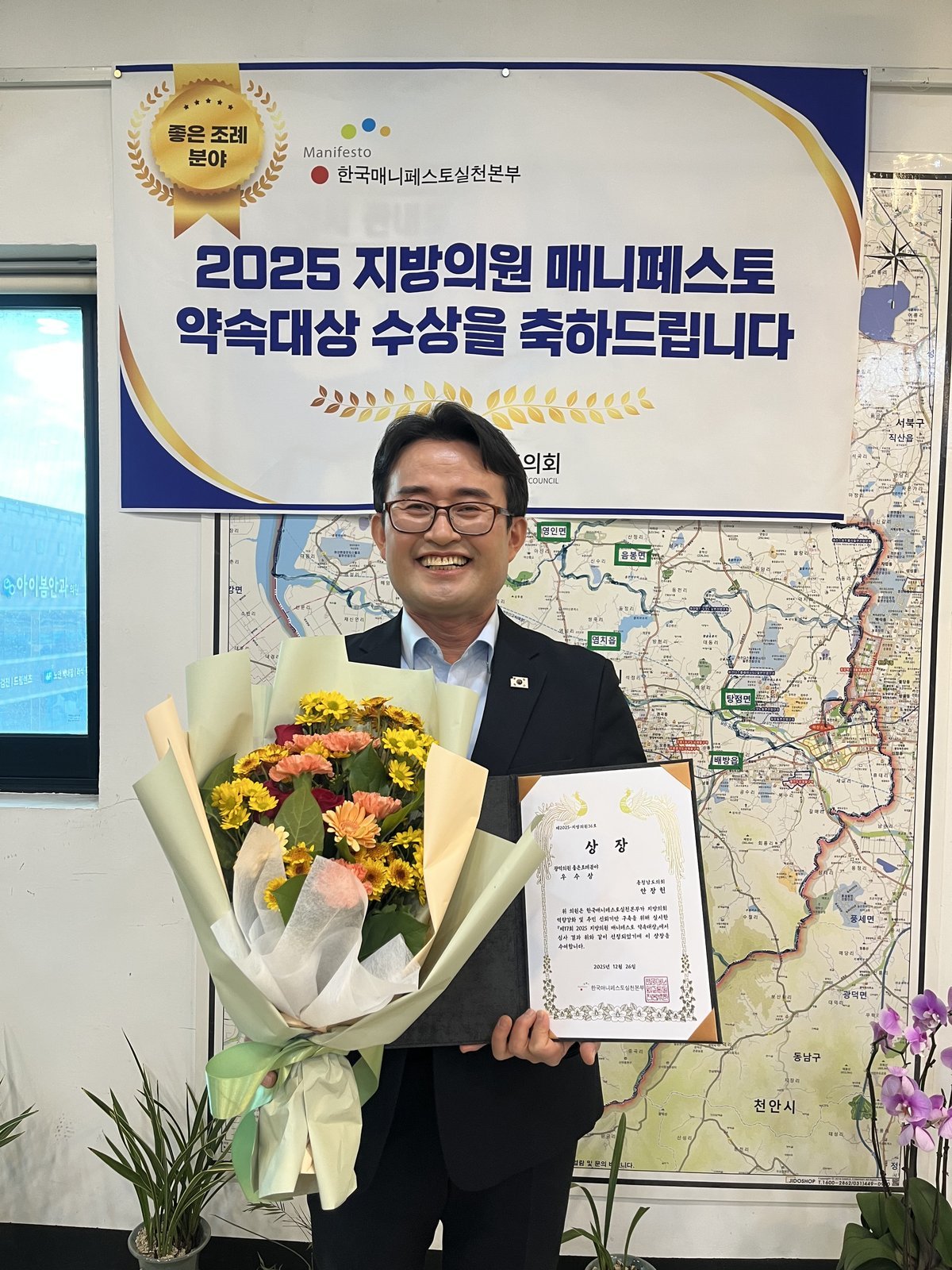 [Ytv영상스토리] 안장헌 충남도의원이 2025 매니페스토 약속대상 좋은조례분야 우수상을 수상하며, 그간의 의정활동 성과를 종합적으로 인정받아 '6관왕'을 달성했다.