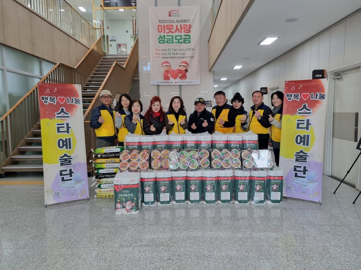 [Ytv영상스토리] 문화예술봉사회 스타예술단은 지난 8일 온양6동 행복키움추진단에 라면 13박스, 휴지 30세트, 쌀 10포대를 기부하며 지역 내 취약계층을 위한 나눔을 실천했다.