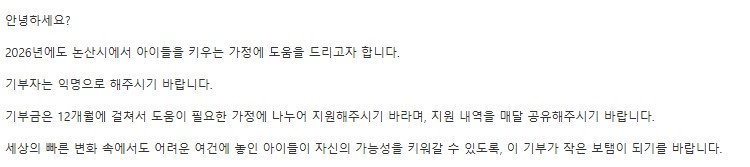 백성현 논산시장은 “매년 이어지는 고액 기부에 다시 한번 감사드린다”며 “기부자님이 강조한 우분투 정신은 우리 모두가 어려운 시대를 살아가는 기본 마음가짐”이라고 말했다. 이어 “시에서도 어려운 이웃을 더욱 세심하게 살피고 지원하는 데 최선을 다하겠다”고 말했다.