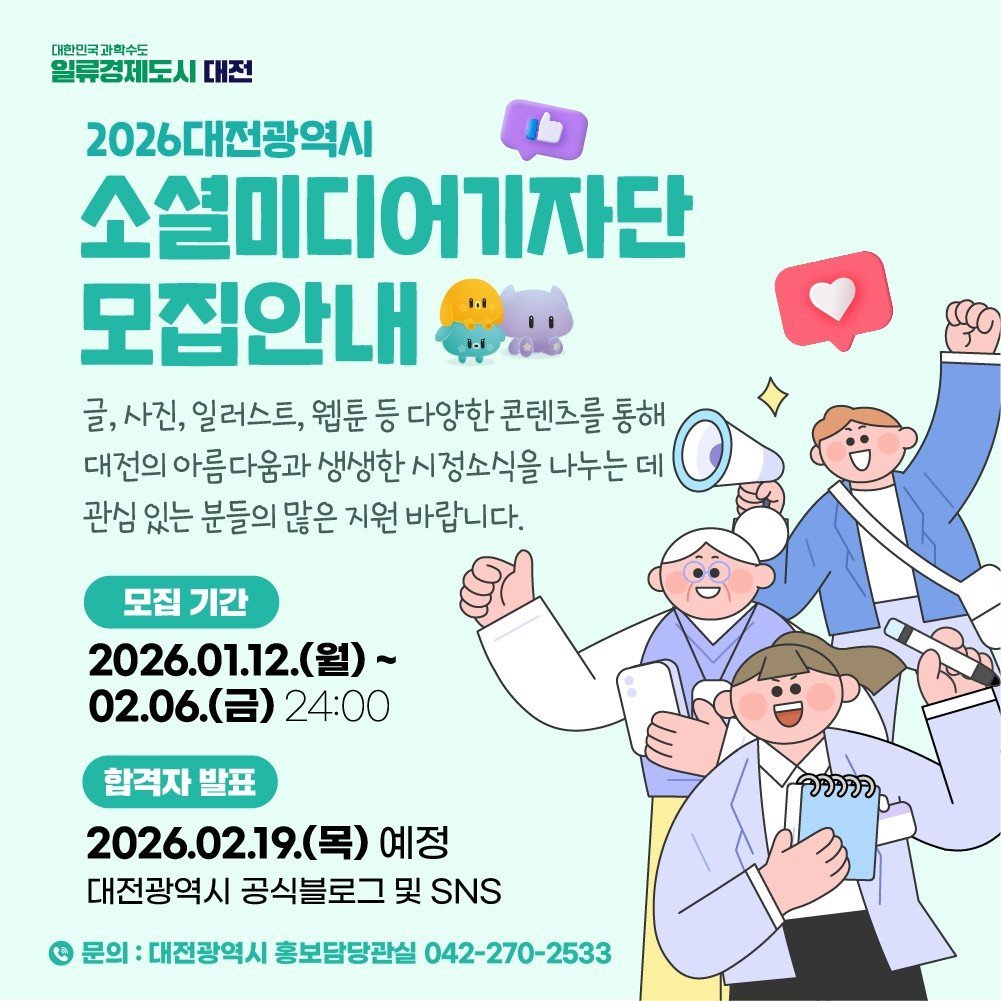 소셜미디어기자단은 총 100명으로 모집 기간은 지난 12일부터 2월 6일까지이며 신청 자격은 대전․세종․충북․충남 거주자 또는 대전 소재 직장인․대학생이면 가능하다.