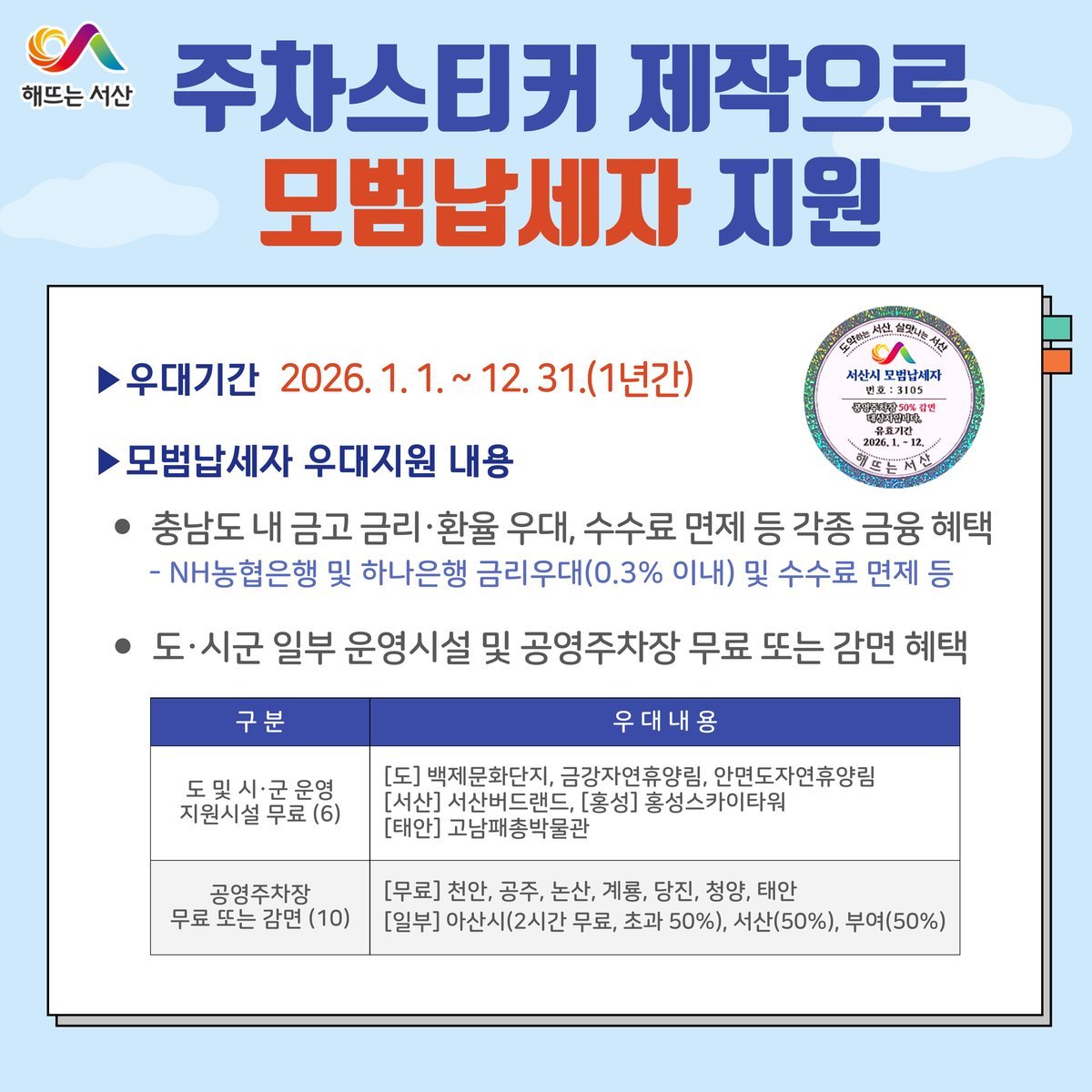 시에 따르면, 서산시 관내 모범납세자는 450명이며 시는 모범납세자증과 함께 주차스티커를 등기우편으로 발송할 계획이다.