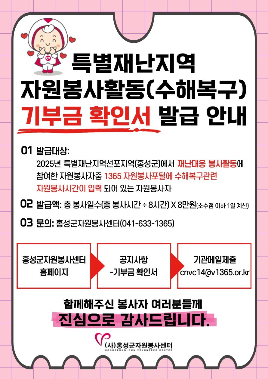 이번 기부금 확인서는 특별재난지역 수해복구에 참여한 자원봉사자의 봉사활동을 사회적으로 인정하고 연말정산 및 종합소득세 신고 시 소득공제 혜택을 받을 수 있도록 지원하기 위한 것이다.
