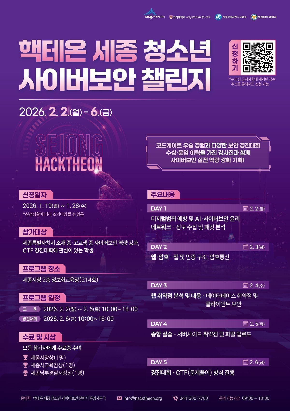 기타 자세한 사항은 핵테온 세종 청소년 사이버보안 챌린지 운영사무국으로 문의하면 된다.