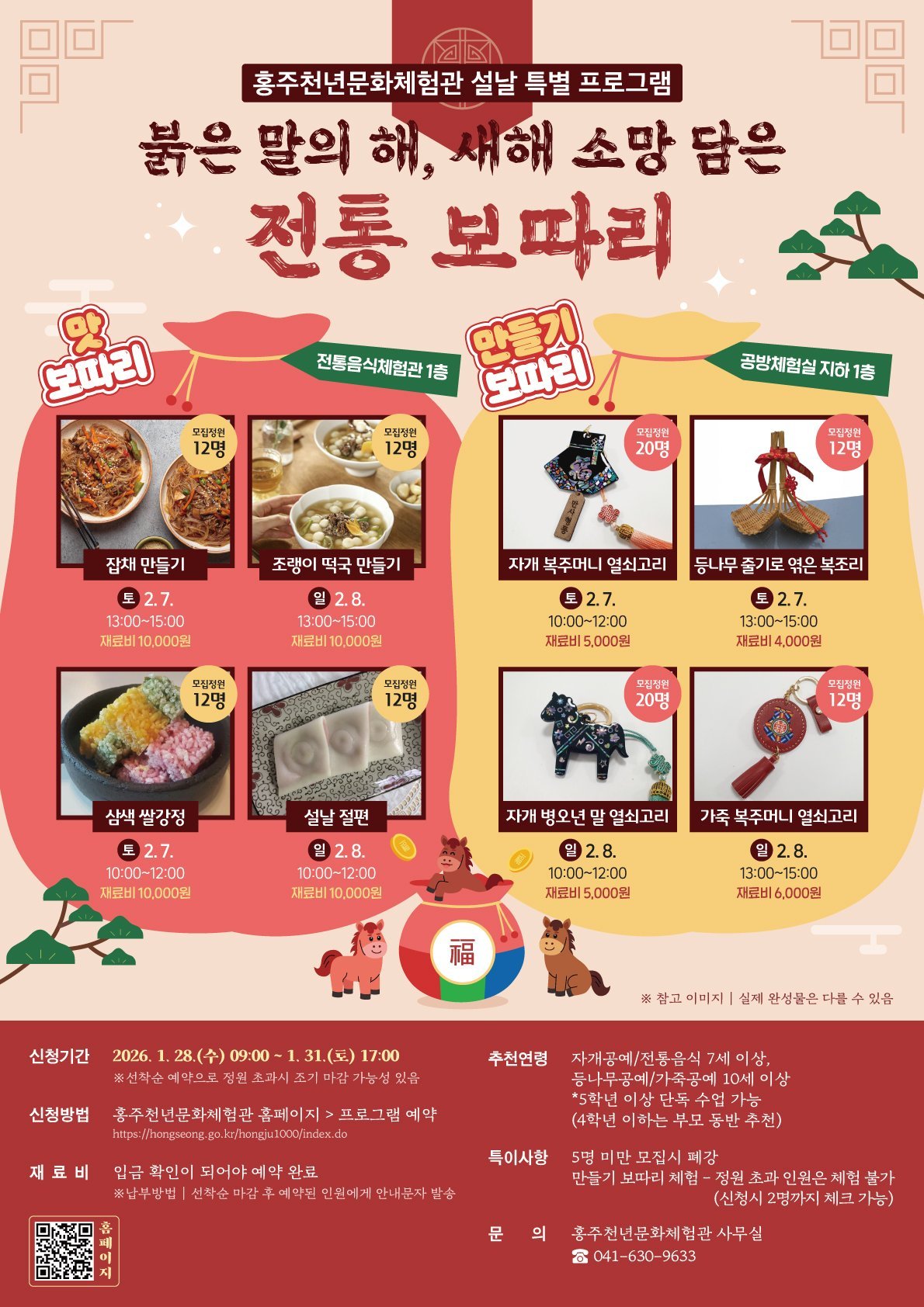 [Ytv영상스토리] 홍성군 홍주천년문화체험관은 붉은 말의 해를 맞이해 설날 특별 프로그램 ‘붉은 말의 해, 새해 소망 담은 전통 보따리’를 다음달 7일부터 8일까지 이틀간 운영한다.