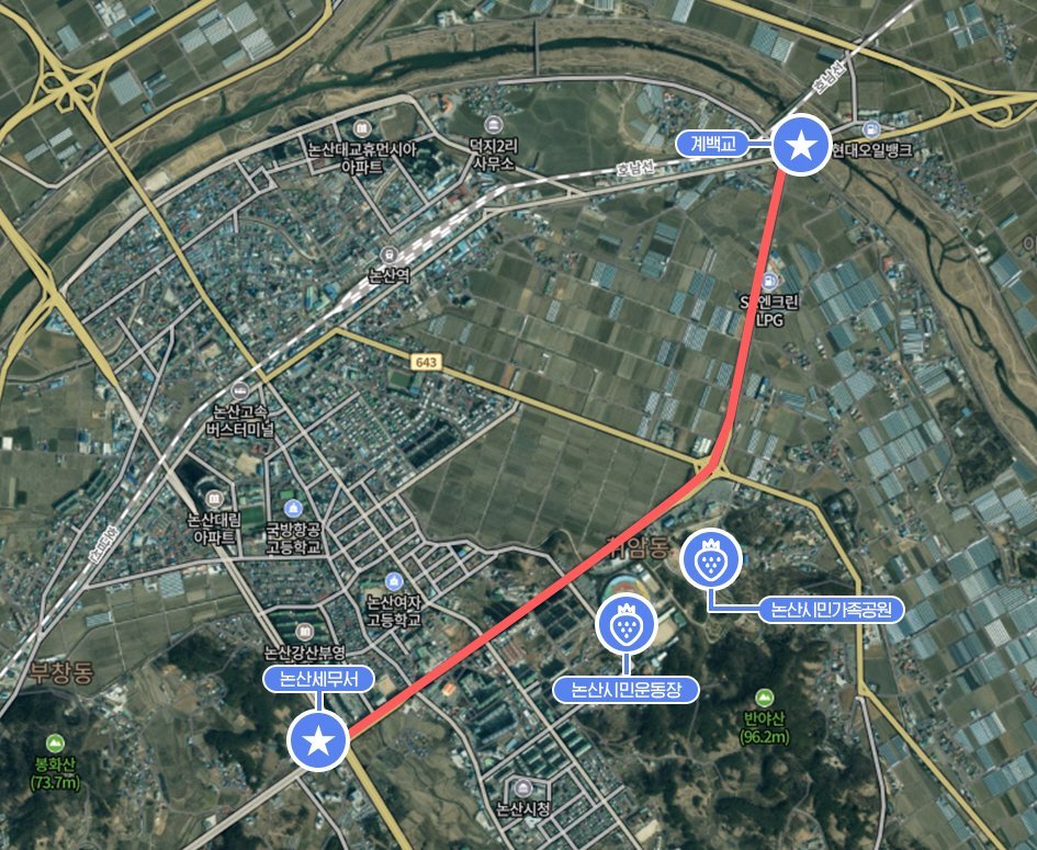 공식 명예도로명 ‘딸기엑스포대로’는 논산 세무서 앞에서 계백교 앞까지 약 3.2km 구간을 포함하며 향후 5년간 사용될 예정이다.