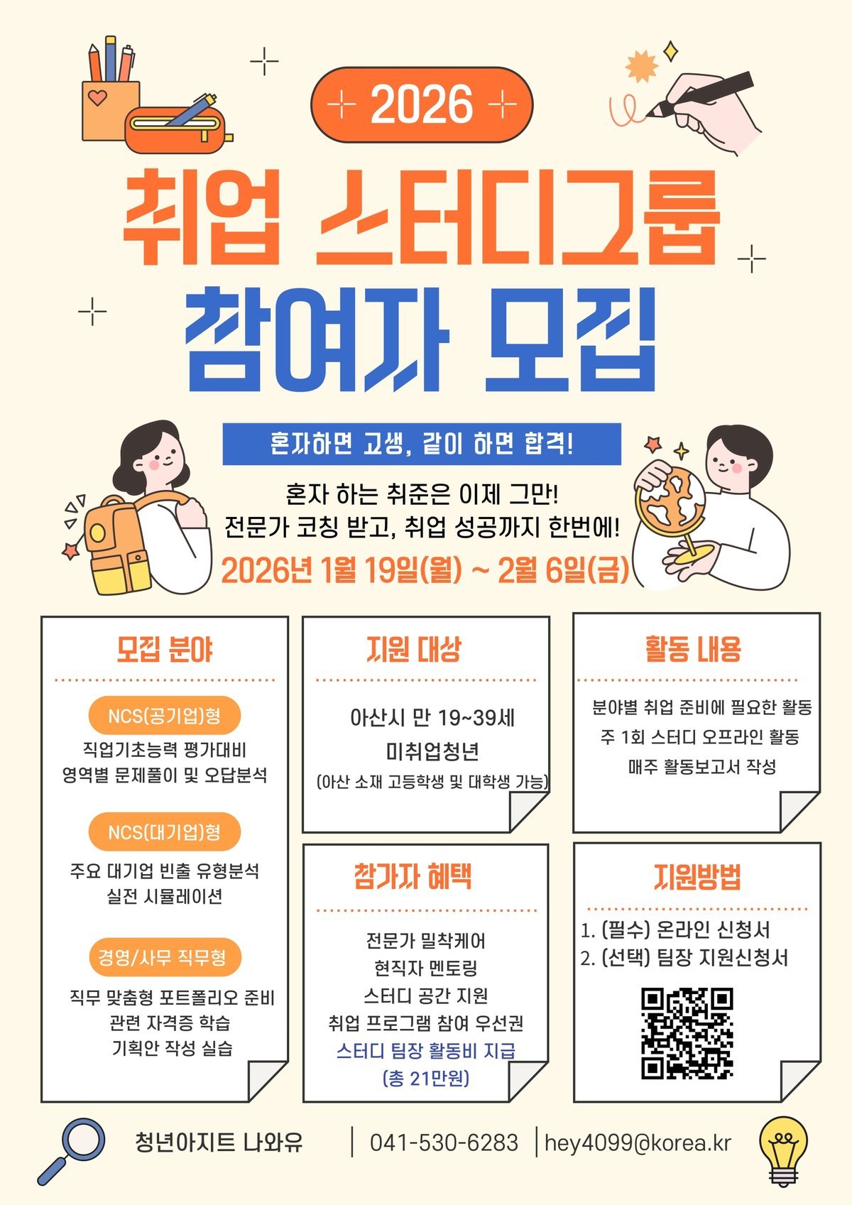아산시 관계자는 “혼자 준비하기 막막한 취업 준비생들이 이번 스터디를 통해 함께 성장하고 원하는 목표를 이룰 수 있기를 바란다”며 “앞으로도 청년들의 수요에 맞춘 실질적인 취업 지원 정책을 지속적으로 확대해 나가겠다”고 말했다.