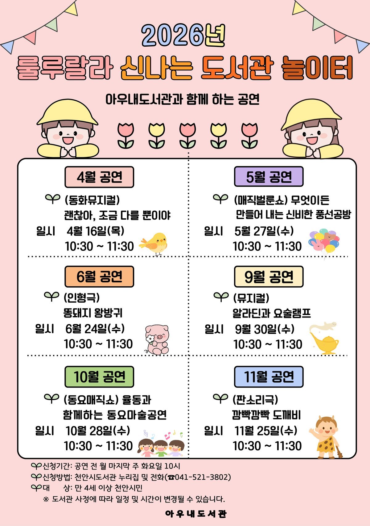 참여 신청은 공연 전월 마지막주 화요일 오전 10시부터 전화 등으로 가능하며 자세한 사항은 천안시도서관 누리집에서 확인할 수 있다.