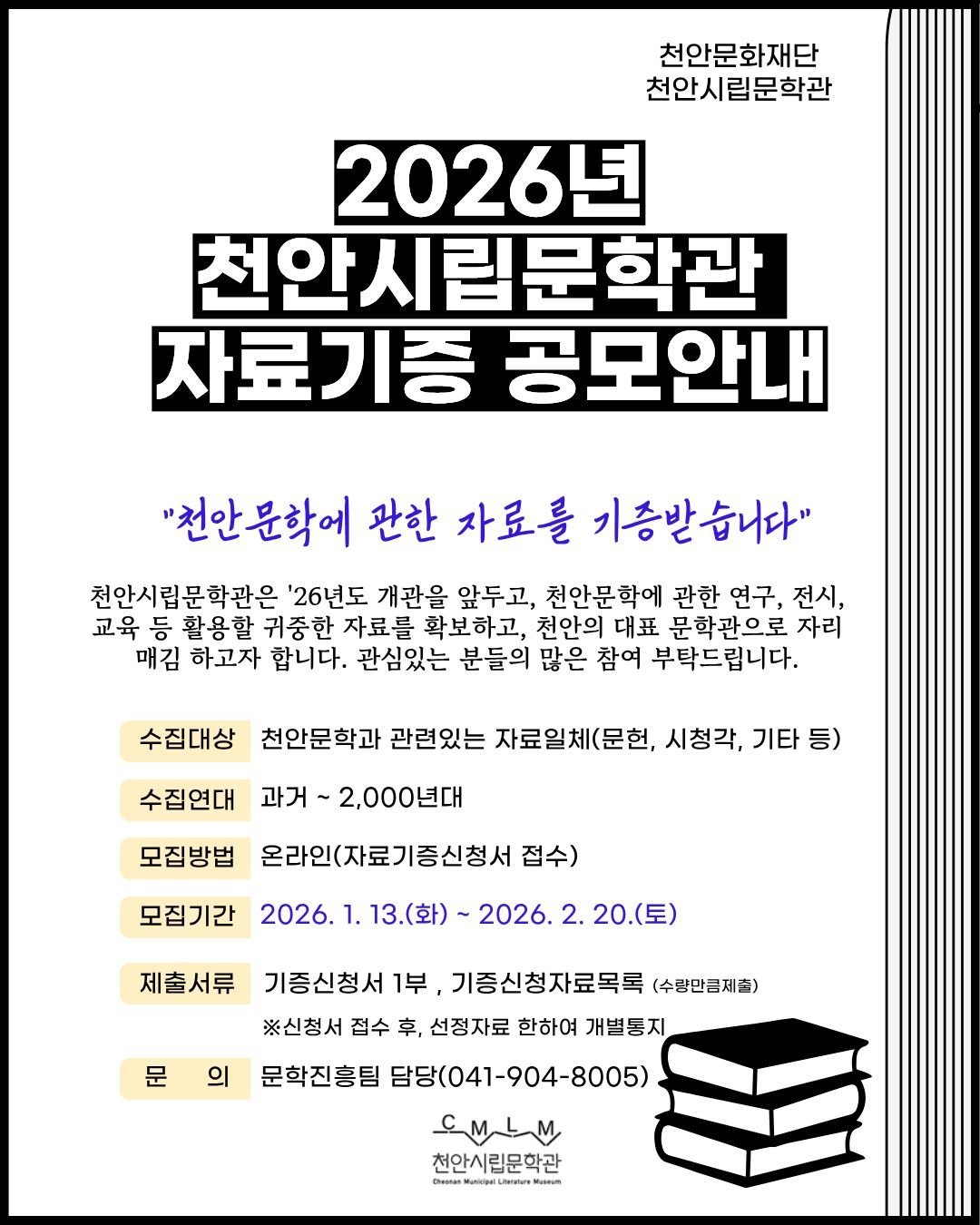 재단은 지역 문학의 흐름과 가치를 체계적으로 수집·보관하고 천안문학의 역사와 성과를 시민과 함께 기록하기 위해 기증 공고를 실시한다.