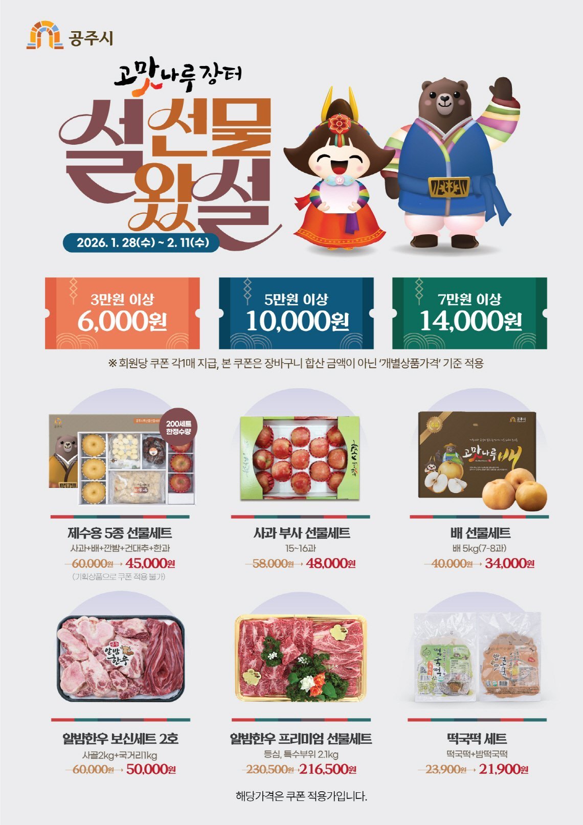 시는 소비자가 상품을 직접 확인한 뒤 구매할 수 있도록 1월 26일부터 2월 11일까지 공주시청 1층 북카페에 설맞이 기획 상품 전시 공간도 마련한다.