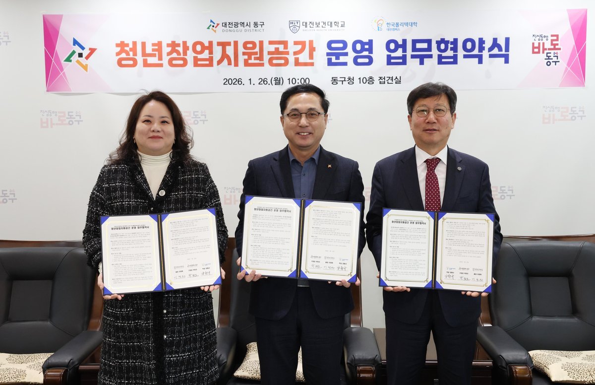 [Ytv영상스토리] 대전 동구는 26일 대전보건대학교·한국폴리텍Ⅳ대학 대전캠퍼스와 청년창업지원공간 운영을 위한 업무협약을 체결했다고 밝혔다.