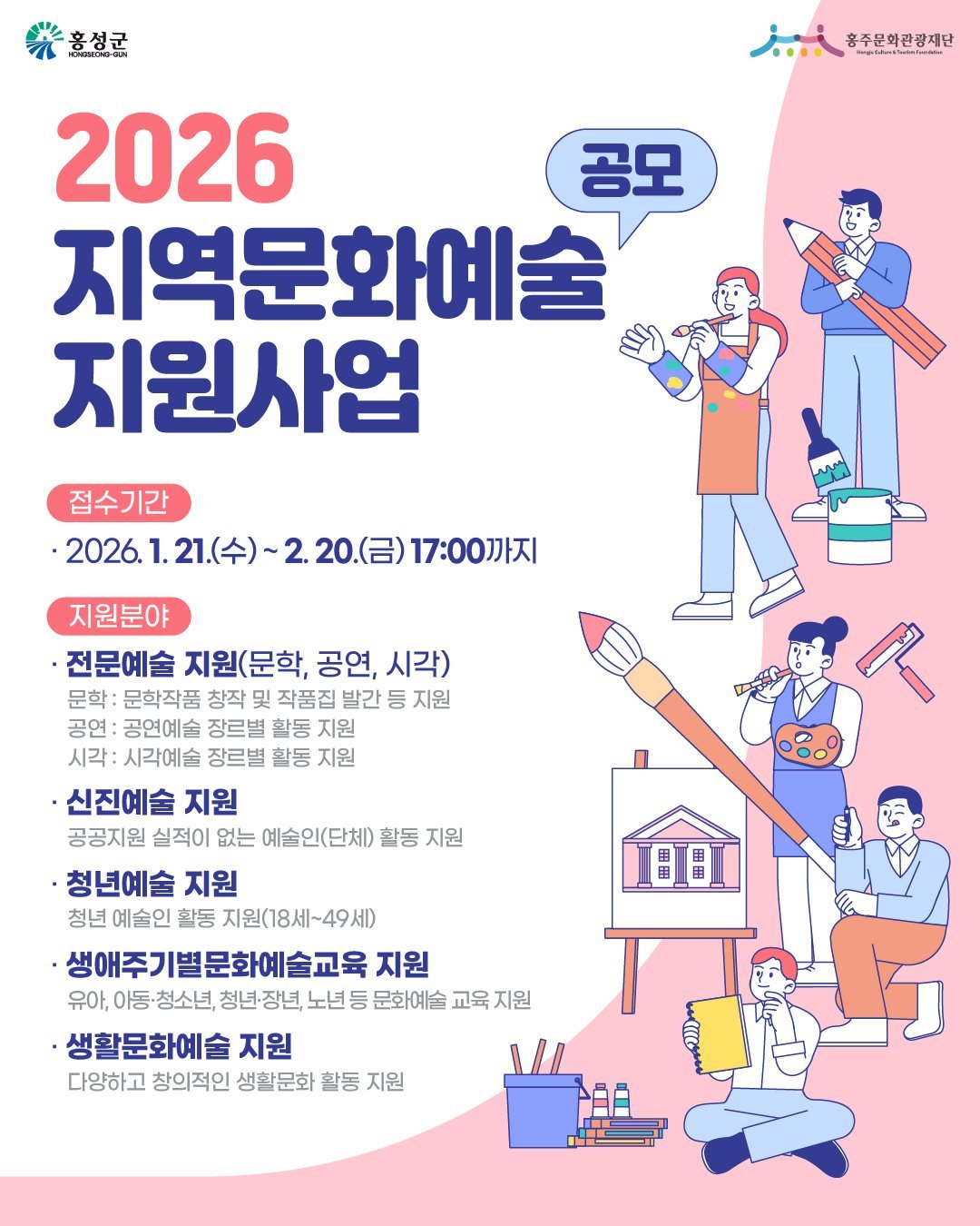 [Ytv영상스토리] 홍주문화관광재단은 홍성군 예술인과 예술단체의 창작활동을 활성화하고 군민 문화향유 기회 확대를 위해‘2026년 지역문화예술지원사업’공모를 진행한다.