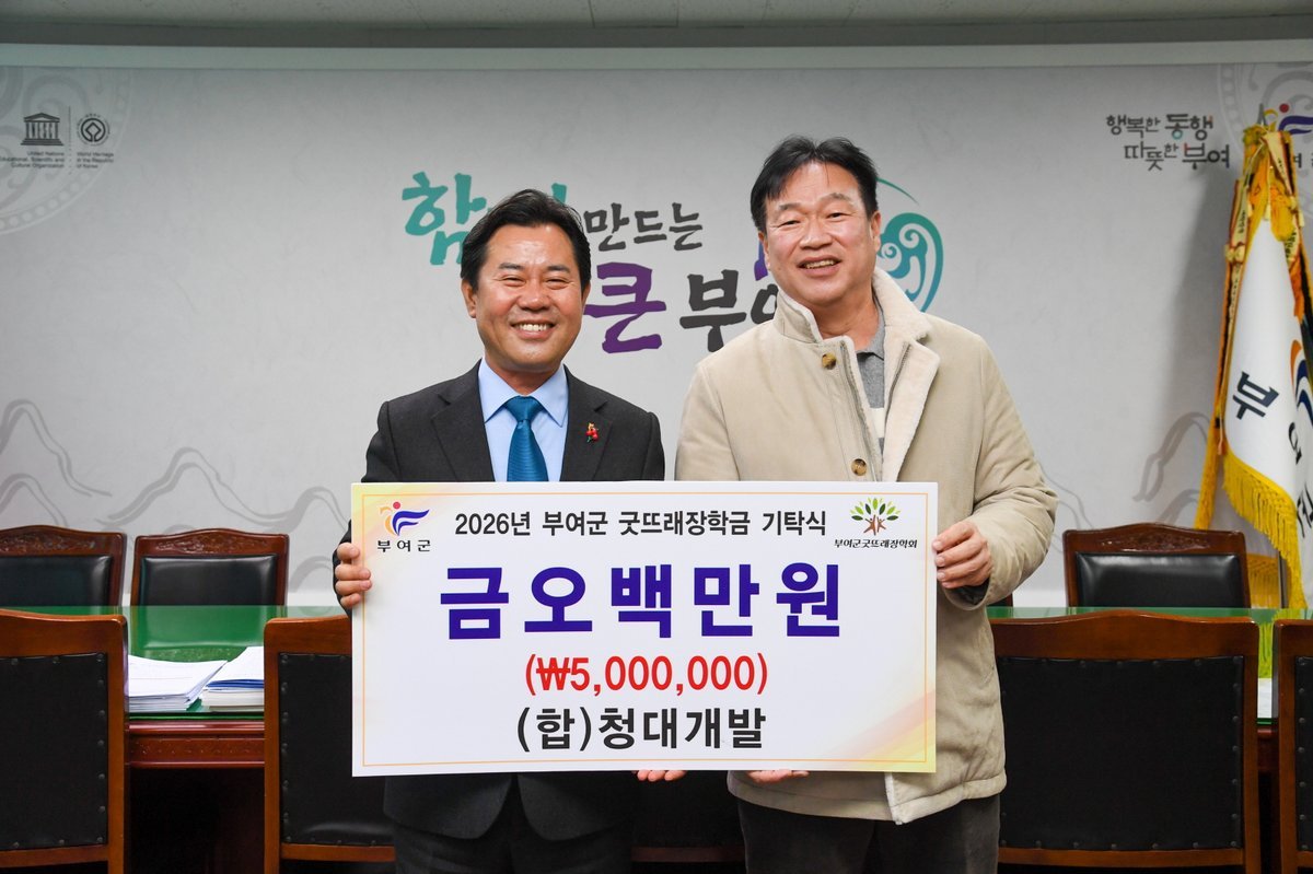 [Ytv영상스토리] 부여군은 규암면에 소재한 청대개발이 인재 육성을 위한 장학금 5백만원을 부여군굿뜨래장학회에 기탁했다고 27일 밝혔다.