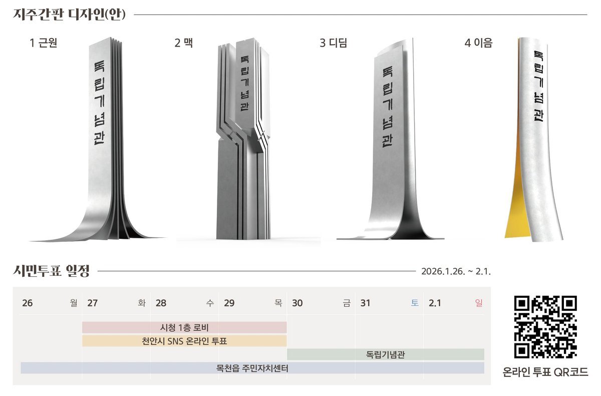 투표 대상은 독립기념관의 상징성을 바탕으로 개발된 디자인 시안으로, 시는 투표 결과를 종합적으로 검토해 디자인을 최종 보완한 뒤 제작·설치 단계에 적극 반영할 계획이다.