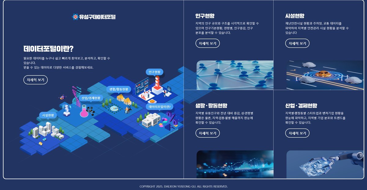 유성구는 주요 행정 데이터를 그래프·지도 등 형태로 분석·시각화한 ‘유성 데이터 시각화 포털’을 구축하고, 28일부터 유성구 공식 홈페이지를 통해 개방한다.