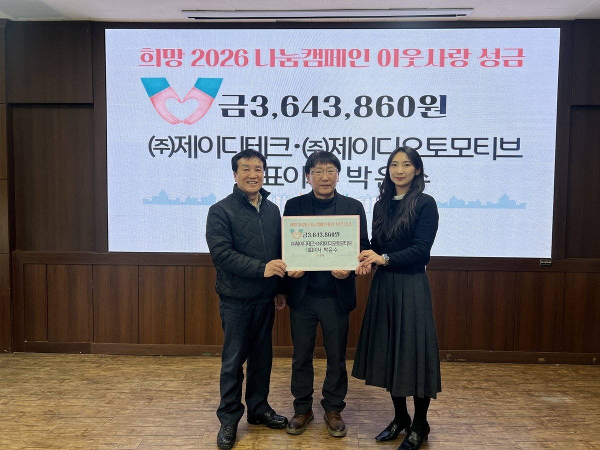 [Ytv영상스토리] 아산시에 소재한 ㈜제이디테크·㈜제이디오토모티브는 지난 28일 둔포면 행정복지센터를 방문해 ‘희망2026나눔캠페인’이웃돕기 성금 364만 3860원을 전달했다.
