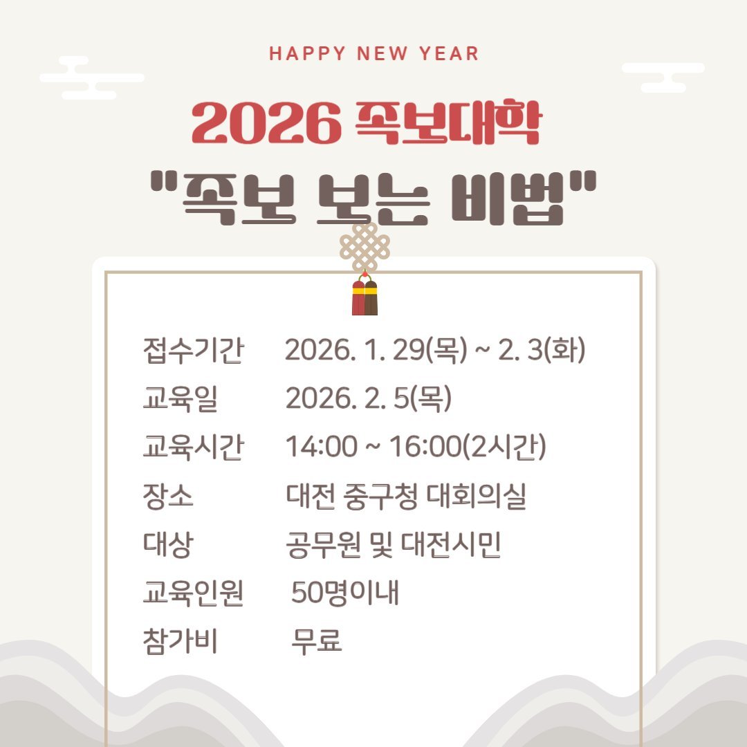이번 교육은 오는 2월 5일 오후 2시부터 4시까지 중구청 대회의실에서 대전 시민 및 공무원 50명을 대상으로 무료로 진행된다.