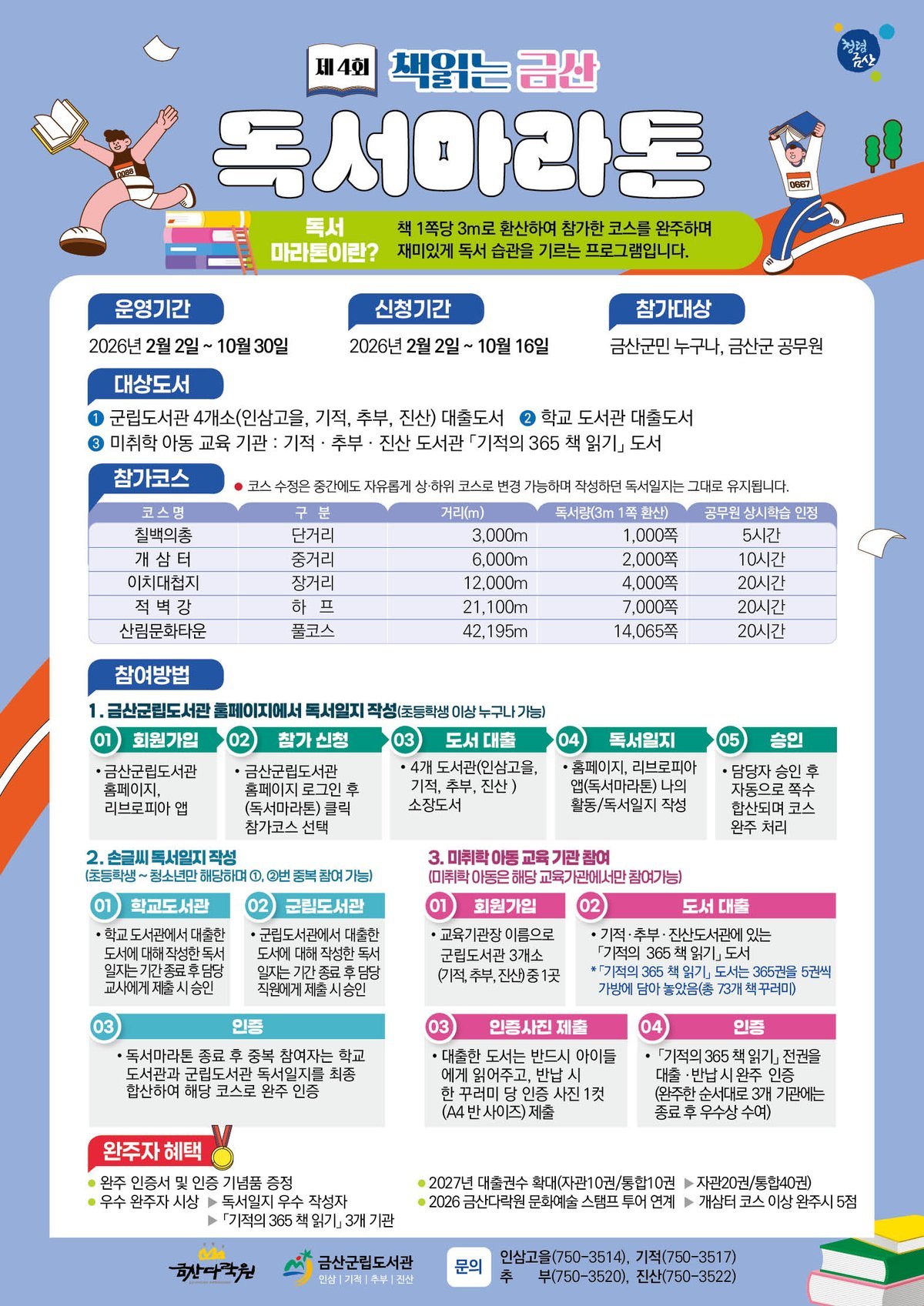 금산군립도서관 회원이라면 누구나 참여할 수 있으며 완주자는 완주 인증서 대출 권수 확대, 인증 기념품 등 혜택을 받을 수 있으며 우수 완주자 시상, 금산다락원 문화예술 스탬프 투어 연계 기회도 제공된다.