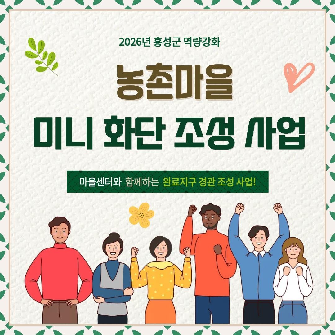 모집 대상은 홍성군 완료지구 내 경관 조성 활동에 관심 있는 농촌마을 20개소로 마을발전계획을 수립하지 않는 마을을 우선 선정할 예정이다.