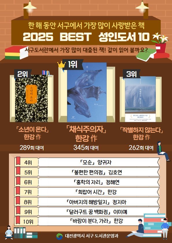 [Ytv영상스토리] 대전 서구는 지난 한 해 성인 도서와 아동 도서 두 부문 ‘2025년 서구에서 가장 사랑받은 도서 대출 순위'를 2일 공개했다. 서구 공공도서관의 지난해 총 대출 권수는 약 116만 권으로 전년에 이어 높은 수준을 유지했다. 서구민들이 가장 많이 대출한 성인 도서 상위권은 한강 작가의 작품들이 나란히 차지했다. ‘채식주의자’가 작년에 이어 연속으로 1위를 차지했으며 이어‘소년이 온다’, ‘작별하지 않는다’가 각각 2위, 3위에 올랐다.